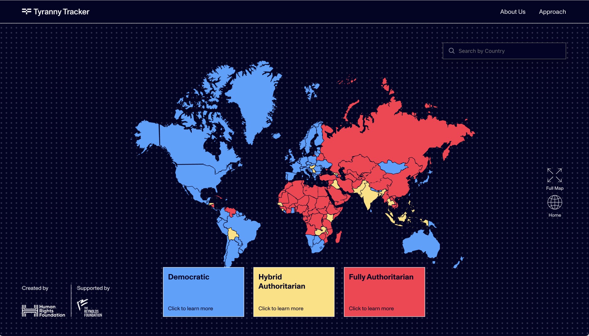 Working with the Human Rights Foundation, we refined an existing data-rich map into a clearer, more usable experience—defining what the Tyranny Tracker needed to communicate and how users engage with it.
